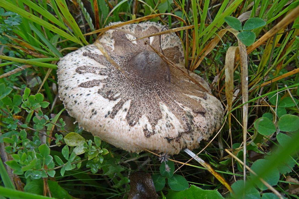 Описание. У молодых грибов белая полушаровидная шляпка, в зрелом возрасте она становится подушкообразной, приобретая темно-коричневый оттенок. Мякоть у гриба белая, плотная, темнеющая при разломе или на разрезе. Шляпка гриба достигает до 18 см в диаметре. Ножка цилиндрическая, белая или серая с темно-серыми продольными чешуйками на поверхности.