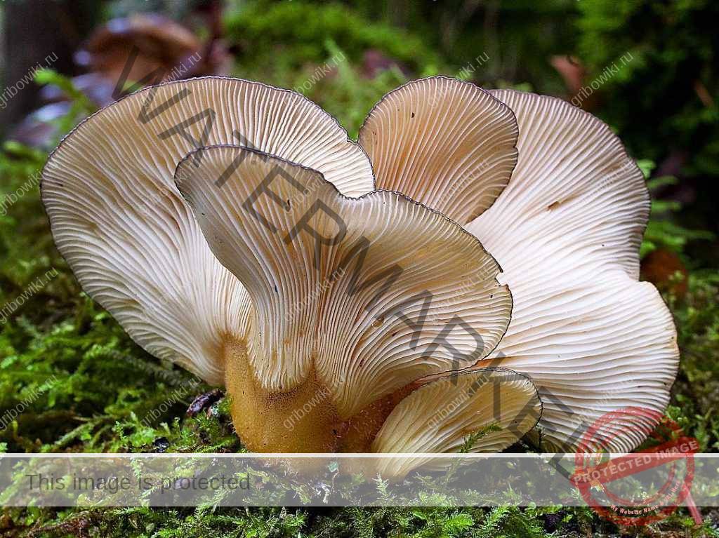 Плодовое тело упругое и плотное, 12-15 см в диаметре. У самого большого гриба ножка в диаметре не превышает 2 см. Внешне кажется, что ее вовсе нет. Гриб иногда плотно прижат к почве.