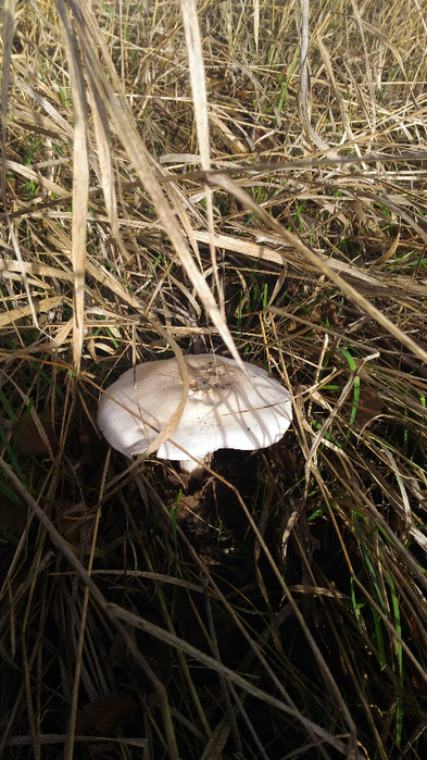 Съедобный гриб с белой гладкой поверхностью. У молодых грибов она с легким оттенком голубизны. Диаметр шляпки – до 20 см. Форма шляпки сначала выпуклая с небольшим бугорком в центре, завернутыми вниз краями. По мере созревания шляпка раскрывается, в сухую погоду растрескивается.
