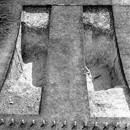 Перед постановкой камня стенки ямы обкладывали деревянными кольями. Благодаря им камень скользил вниз, не осыпая землю. Оббитые в форме тупого конуса нижние части блоков можно было поворачивать по своей оси даже после того, как земля была утрамбована.