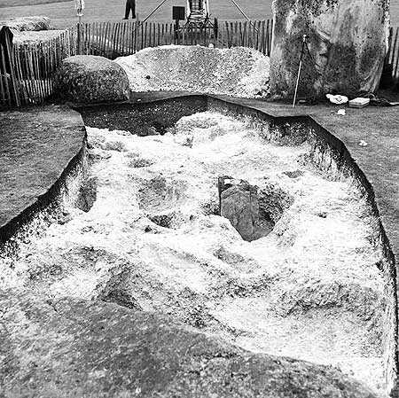 По словам Джеральда Хокинса, для установки блоков сначала откапывалась яма по размеру, три стенки которой были отвесными, а одна с углом в 45 градусов, использовавшаяся в качестве приемного пандуса.