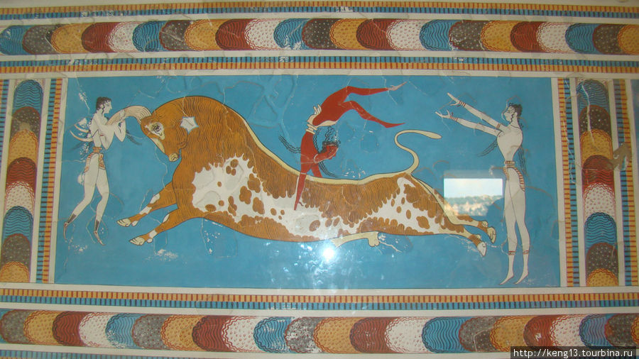 Здания были украшены яркими произведениями искусства, отражающими почтение культуры к быкам: фрески и статуэтки, датируемые 1700–1400 гг. до н.э., изображают фигуры, прыгающие через быков в ритуале под названием тауро-катапсия . Этот обряд, возможно, практиковался во время священных церемоний и жертвоприношений богам. Символ плодородия во многих религиях, быков ритуально убивали обоюдоострым топором или лабрисом, символом королевской власти.