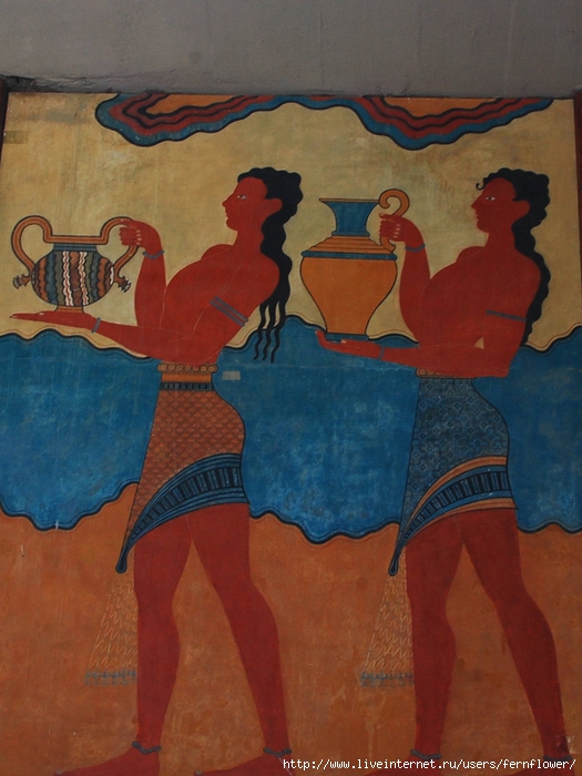 Надо ли удивляться тому, что ученые, исследовавшие характер настенных росписей и архитектурных особенностей лабиринта, употребили слово «модерн»? В самом деле, в этом дворце, который не уступал по своим размерам Букингемскому, были и водоотводные каналы, и великолепные банные помещения, и даже вентиляция. Параллель с современностью напрашивалась и в изображениях людей, позволявших судить об их манерах и критской моде. Если в начале среднеминойского периода женщины носили высокие остроконечные головные уборы и длинные пестрые платья с поясом, глубоким декольте и высоким корсажем, то затем их одежда приобрела еще более изысканный вид. И когда сегодня мы говорим, что женщины в подражание мужчинам носят короткие волосы, то критские дамы были с нынешней точки зрения сверхмодницами, ибо имели прически еще короче, нежели их кавалеры.