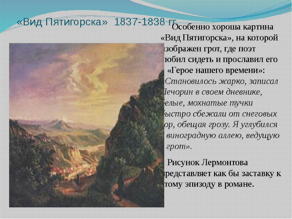 Восприятие величественной природы Кавказских гор находит свое отражение в романтическом мироощущении Лермонтова и в его душевных переживаниях, становясь фактом его личной биографии и рождая наполненные подлинным чувством строки: «Чтоб вечно их помнить, там надо быть раз».