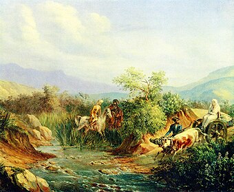 Слева на переднем плане картины изображен крутой каменистый спуск к реке, обрамленный ветвями деревьев. Не здесь ли спускался «…к потоку с высоты, держась за гибкие кусты» герой поэмы, томимый жаждой.