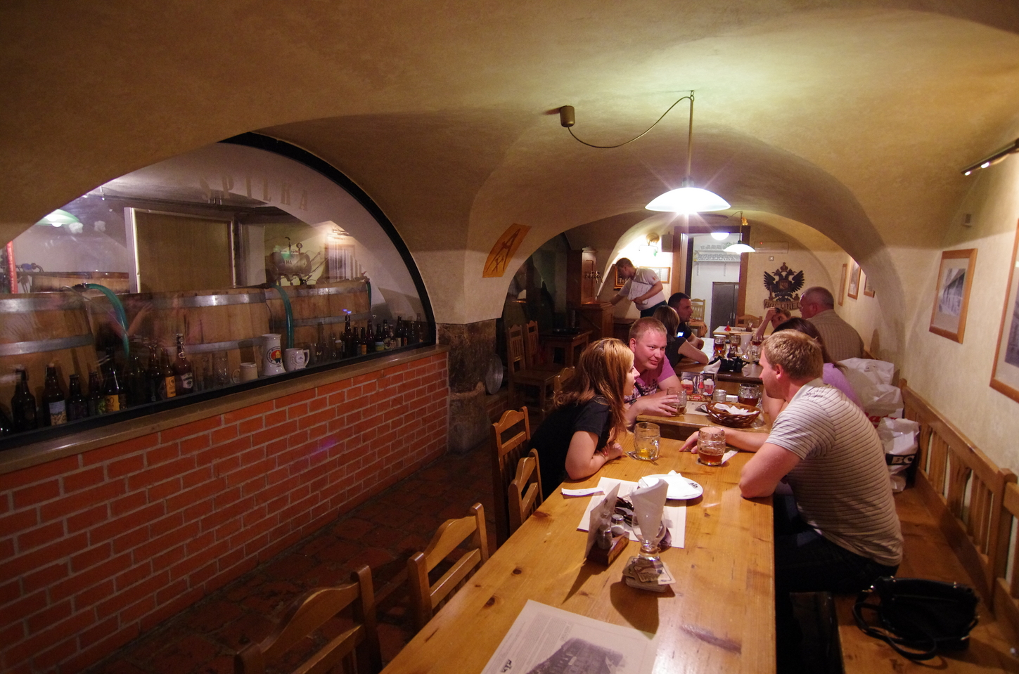 Место это не очень уютное, но довольно популярное. Здесь вместо вешалок стоят грабли, плафоны светильников сделаны из ведер, пиво приносят в огромных кружках. Оно стоит от 21 до 65 Kč. Берем по кружке и отмечаем – вкусное, пенное, действительно уникальное!