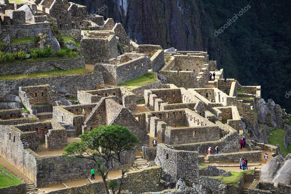 Центральная площадь Мачу-Пикчу состоит из рядов каменных сооружений без крыш, встроенных в крутые террасы, обращенные наружу, откуда открывается великолепный вид на Уайна-Пикчу.