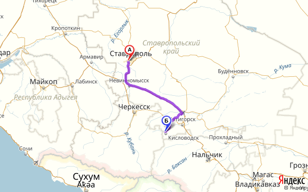 Перемещая центр схемы, или активируя схему «Спутник» — появляется весь Майкоп на карте России, границы городской территории и близлежащие объекты.
