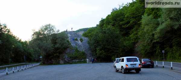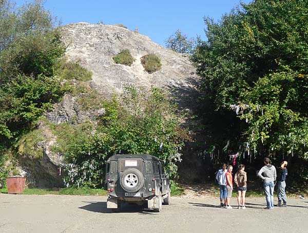 В сухую погоду по крутой тропе можно забраться наверх. Понадобится только удобная, нескользящая обувь и немного ловкости. По отзывам туристов, отсюда открывается великолепный вид на извилистую дорогу, зеленые вершины хребта Уна-Коз и яркую природу вокруг. Фото с этой точки получаются эффектными и запоминающимися. Один из кустарников на верхушке украшен лентами: их оставляют путешественники на удачу, загадывая желание или надеясь вернуться сюда снова.