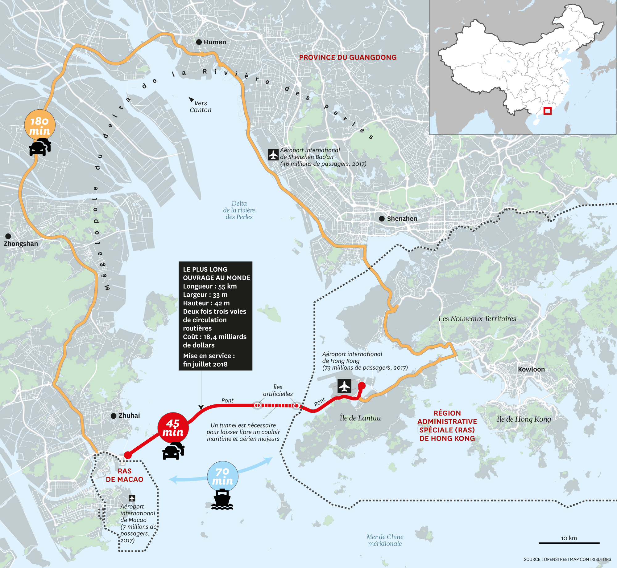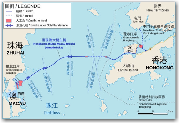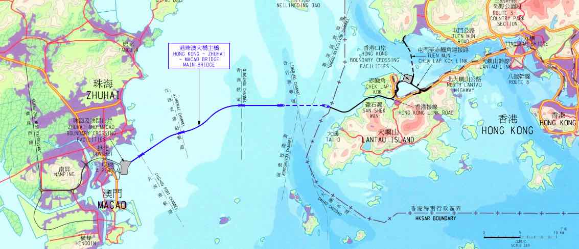 Интересная штука. На мосту действует правостороннее движение, несмотря на то, что в Гонконге и Макао водят с левой стороны. Дело в том, что мост проходит по территориальным водам Китая. Очередной пример трения между Китаем и территориями, которые он не хочет признавать как независимые.