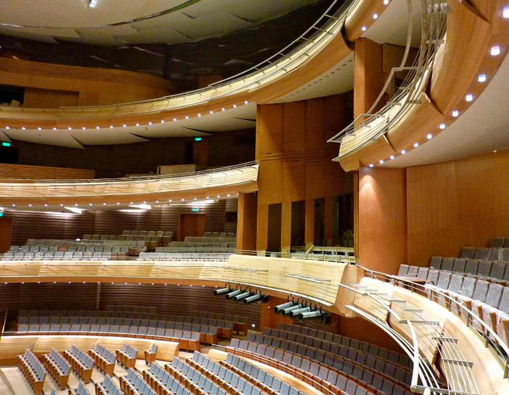Резные облицовочные панели из бука, которые украшают балконы, спроектированы в соответствии с требованиями акустики. Поскольку ярусов три, а не четыре, пространство между ними увеличено, что способствует лучшему распространению звука (особенно в последних рядах).