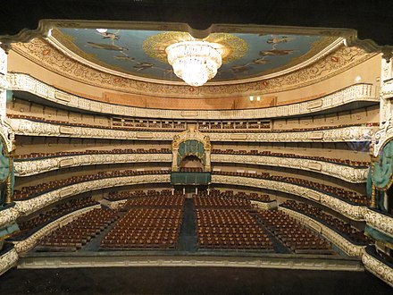 «В просторных интерьерах театра – бежевый мрамор, сияние кристаллов Сваровски, подсвеченные стены из прозрачного оникса и панорамные окна с видом на город… Великолепный зал в форме подковы отделан буком и дубом, а резные потолки и рельефные фронтоны лож с вкраплениями хрусталя подчеркивают стилевое единство интерьера». (The Telegraph)