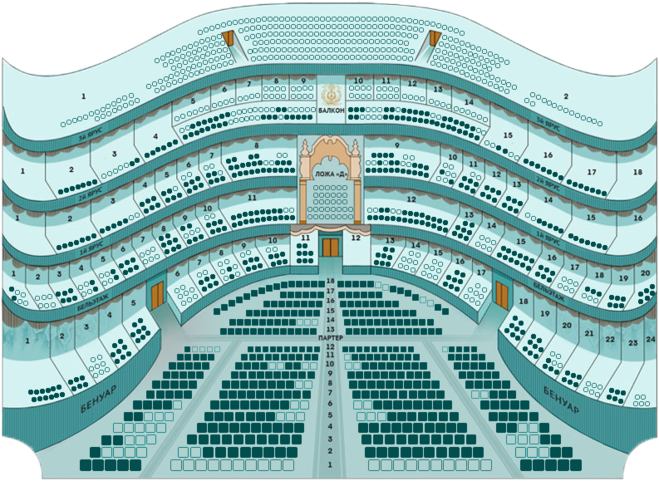 Меломаны по соотношению цена и качество предпочитают здесь места в 1-м и 2-м ярусе! Здесь отличный звук, однако, сцена находится далеко, и без бинокля не обойтись. Кроме того, в первых рядах ярусов обзору несколько мешают ограждения — закрывают часть сцены. Поэтому здесь лучше покупать билеты на 2-й или даже 3-й ряд.