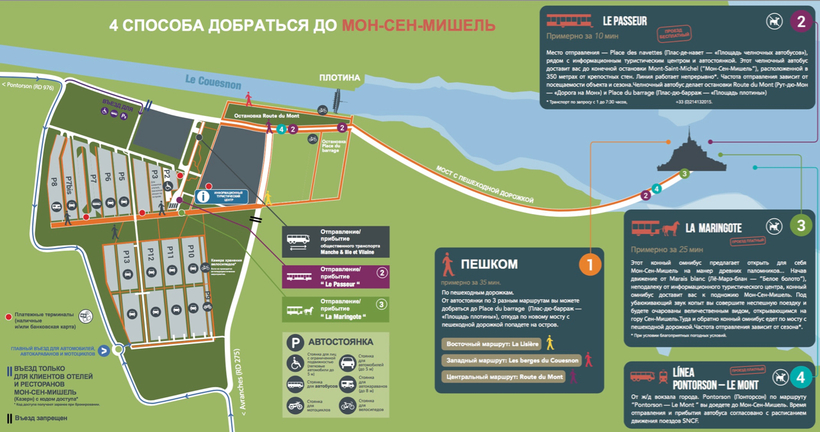 На карте показан новый светлый мост Pont-passerelle , соединяющий материк с горой, которая в конечном итоге (2014 г.) заменит дамбу, показанную на карте. Сегодня можно пройти пешком, как древние паломники, или на челноках (пройти еще немного: 400 метров). Также возможен вариант перевозки на конной тяге. Парковка больше не разрешена у подножия горы. Парковка на материке дорогая.