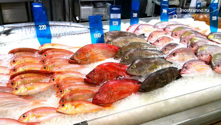 Рыба в супермаркете стоит от 60 бат за кг, кальмары – от 70 бат, большие креветки – от 200 бат за кг.