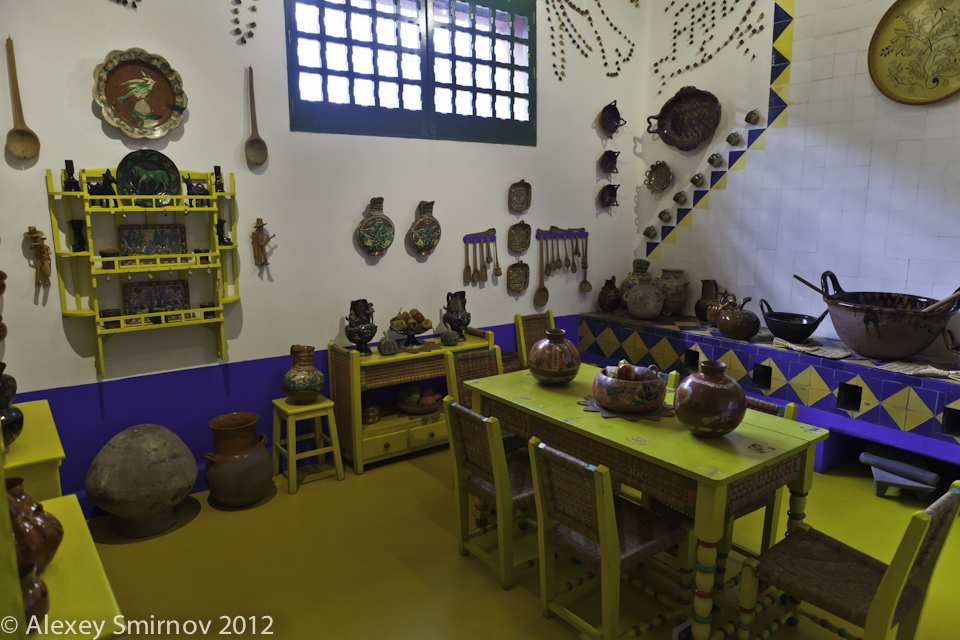 Далее – кухня и столовая, где все точно так же, как было при жизни Фриды: разноцветная плитка, желтый стол, многочисленная посуда, керамика, разнокалиберные горшки ручной работы – по словам сестры Рут, именно здесь художница проводила большую часть времени…