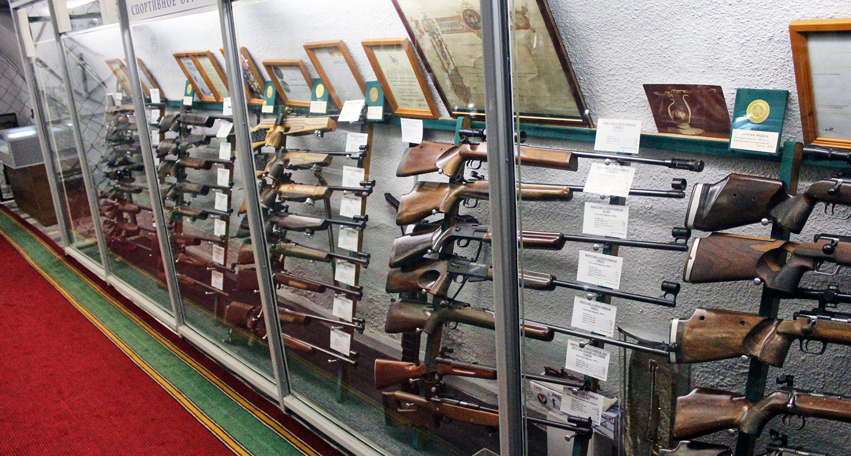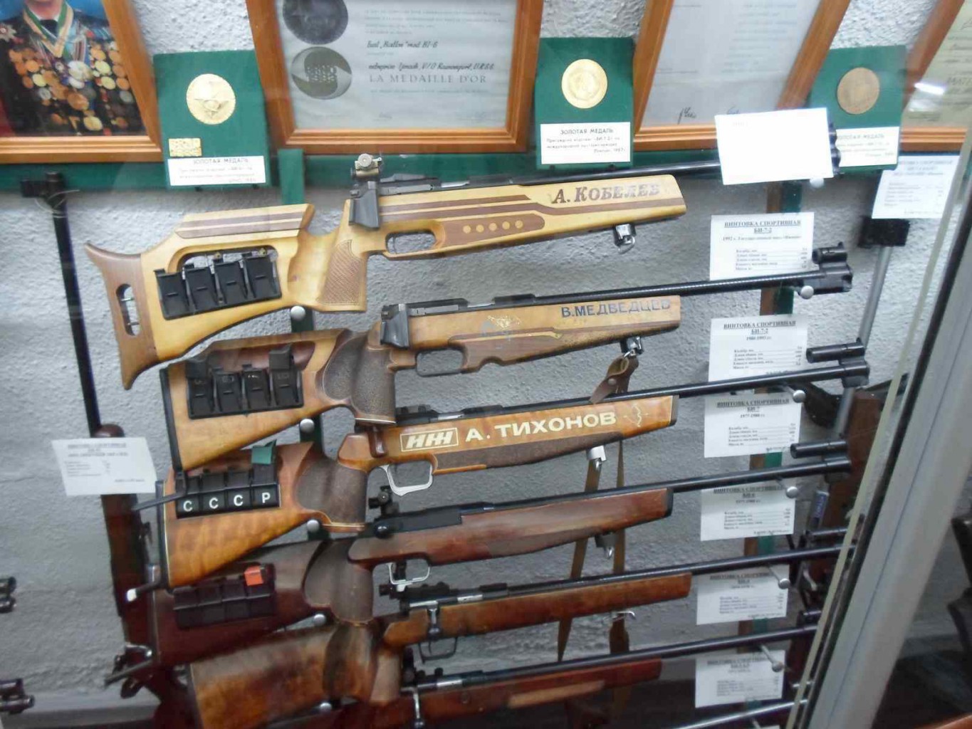 Представленные в этой витрине первые три ружья и последнее ружье с черной отделкой производятся на Ижмаше, а карабин «Вепрь» — на Вятско-Полянском заводе.