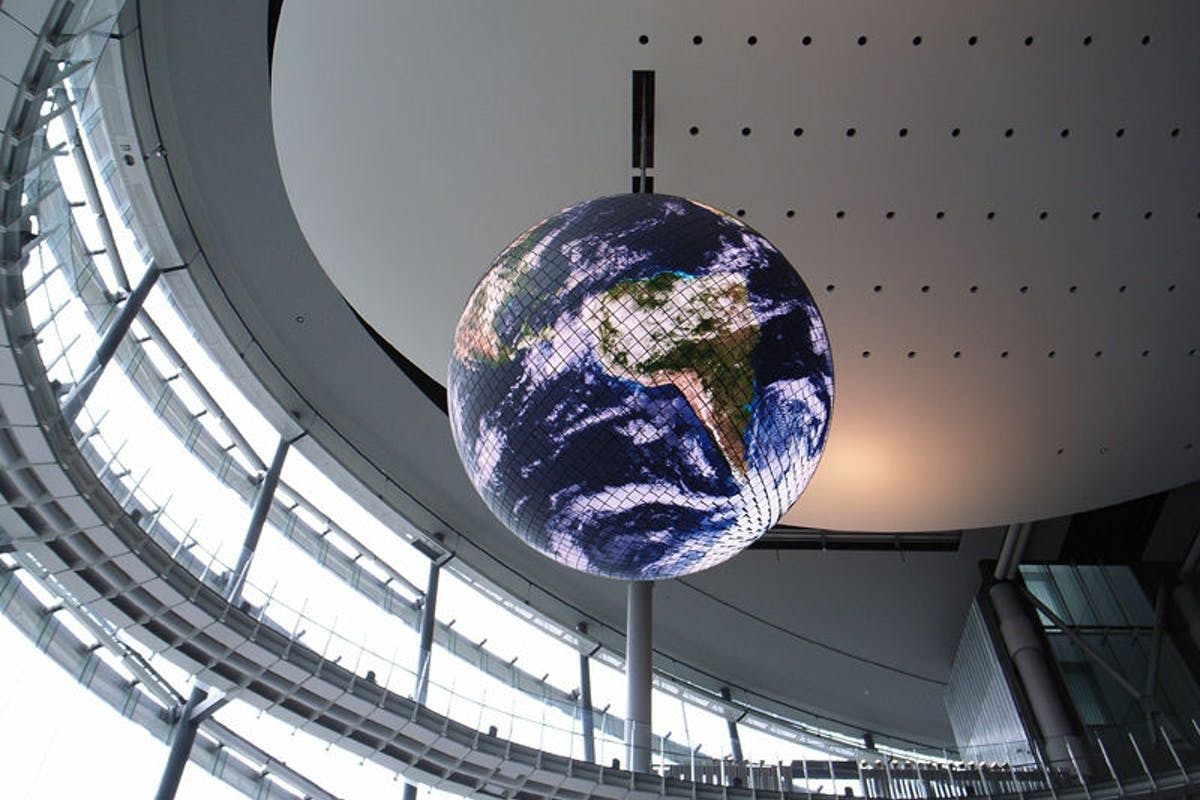 Geo-Cosmos , расположенный в атриуме, поднимающемся с первого по шестой этажи, — это то, что здесь в первую очередь привлекает внимание посетителей. Созданный из органических панелей в форме сферы, Geo-Cosmos является моделью Земли и является первой в своем роде моделью в мире. С разрешением, превышающим десять миллионов пикселей, Geo-Cosmos отображает различные данные, включая растительный покров и плотность озона.Данные обновляются ежедневно, что позволяет посетителям наблюдать за текущим состоянием Земли со всех сторон.