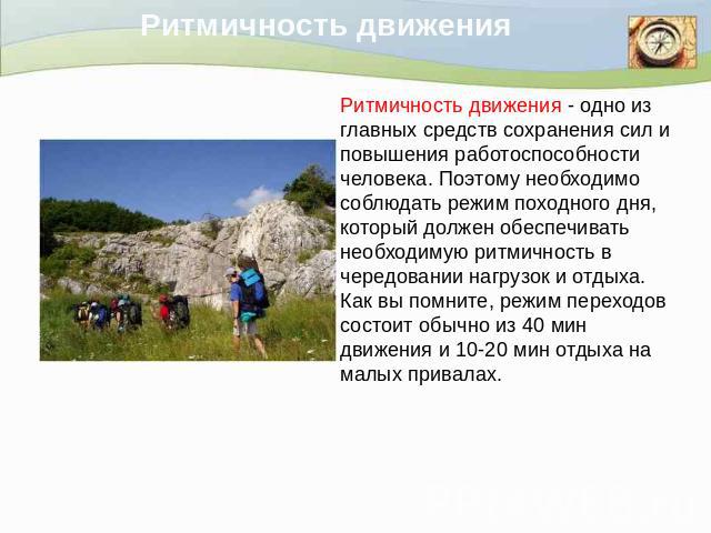 10 км по грунтовой прямой дороге и 10 км по тропе в горку и затем вниз — это «две большие разницы». Средняя скорость туристов в горном походе (с учётом всех привалов остановок) — 1,5 км/ч (!!!). Соответственно, если предстоит пройти 15 км и из лагеря группа выдвинулась в 10:00 — рассчитывайте, что на следующей стоянке вы окажетесь к 20:00. - Характер дороги или тропы — грунтовая лесная, каменистая, осыпь, травяной склон или вообще отсутствие тропы. Характер реки — спокойная или порожистая, какие берега, течение. Для велопохода: асфальт, хорошая грунтовка или вся в выбоинах, полевая дорога или тропа с корнями и т. п.