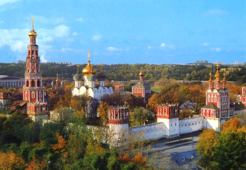 В Москве: Средняя зона… укрепленные монастыри, Новодевичий монастырь XVI века с прекрасным Смоленским собором, высокая колокольня которого (1690 г.) возвышается над церквями и зданиями в зубчатых стенах и башнях монастыря. В соборе сейчас находится музей Новодевичьего монастыря, а в комплекс входит кладбище, на котором находятся Хрущев и другие выдающиеся деятели…