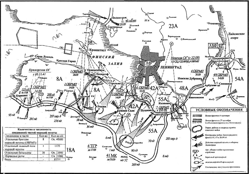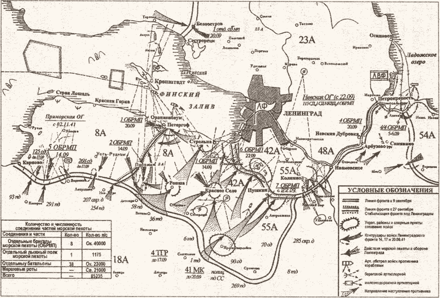- в районе Ораниенбаума на небольшом плацдарме, прикрывавшем Кронштадт, яростно оборонялась морская пехота – «чёрные дьяволы», как называли её немцы.