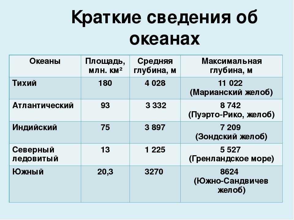 Океаны – Антарктический, Северный Ледовитый, Атлантический, Тихий и Индийский.