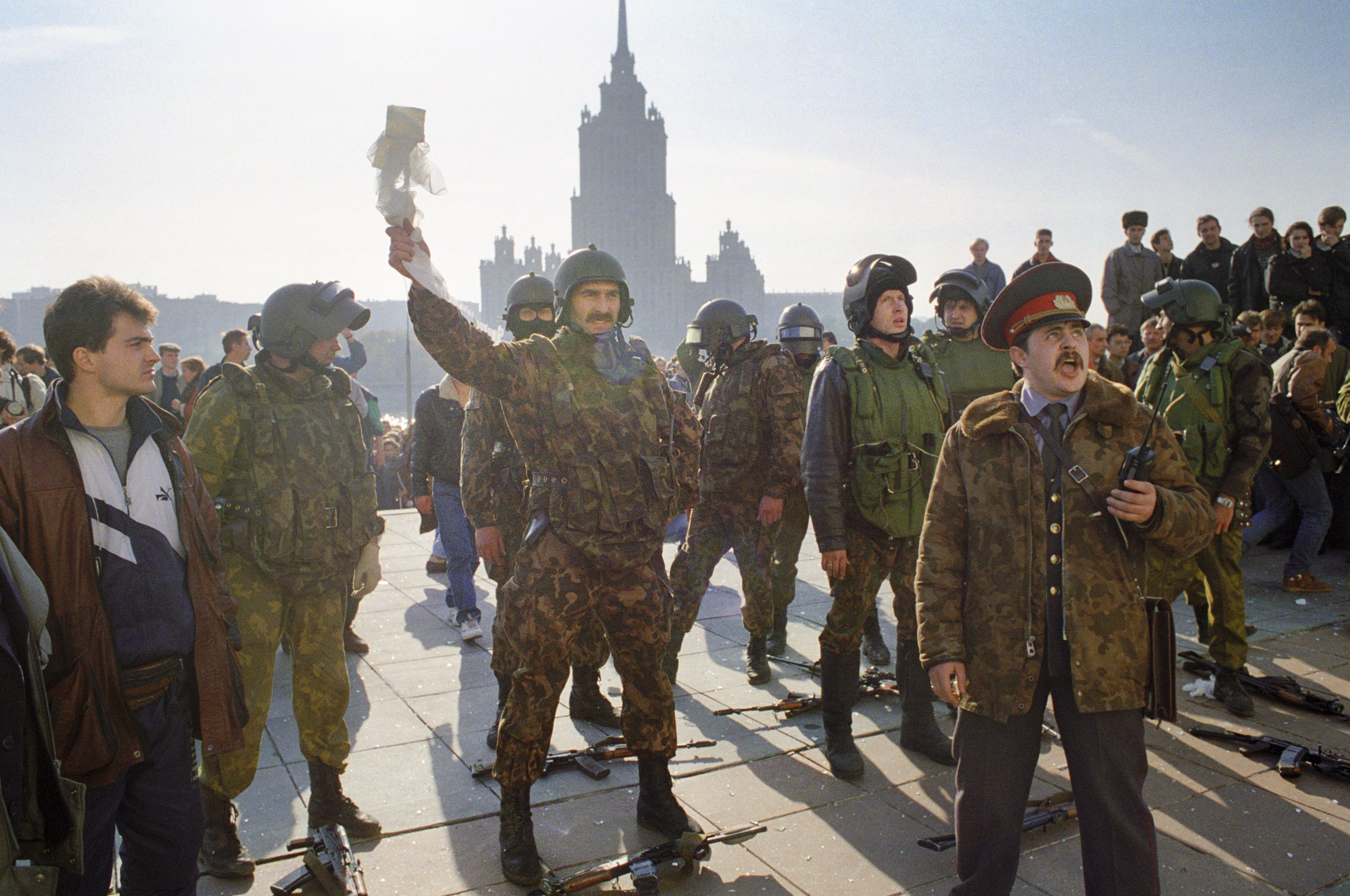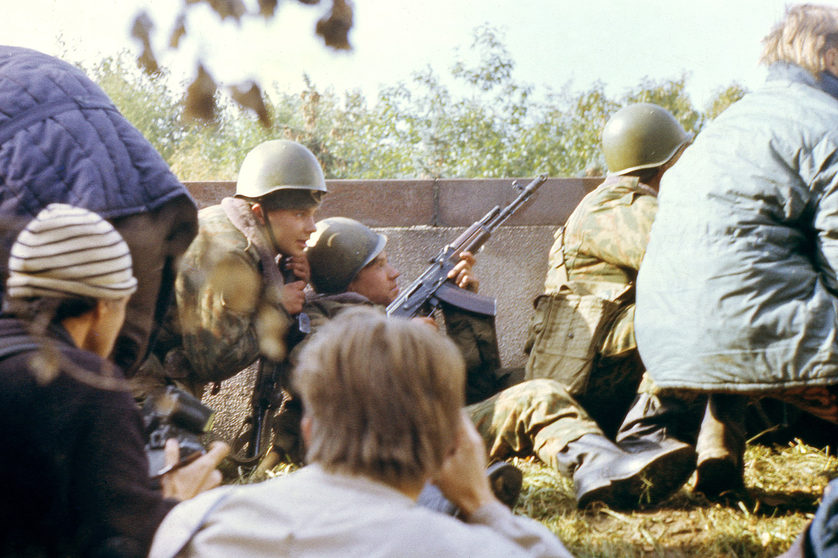 Солдаты у российского Белого дома 6 октября 1993 г. после нападения на здание парламента в предыдущие дни. (AP / Мишель Эйлер)