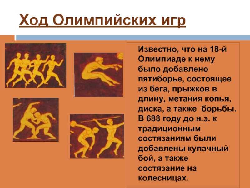 stadion , метание копья (из дерева и метание с помощью кожаного ремешка) и борьба. Неясно, как спортсмен выиграл общий зачет, три победы в зачете могли гарантировать общую победу. - бокс — добавлен в 688 г. до н.э. Спортсмены носили кожаные ремешки ( himantes ) вокруг рук, первоначально в качестве защиты, но они превратились в разрушительное оружие с добавлением металлических частей. Правила сводились к запрету ударов ниже пояса и удержания. Серьезные травмы были обычным явлением, и смертельные случаи не были неизвестны.