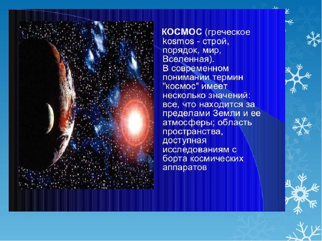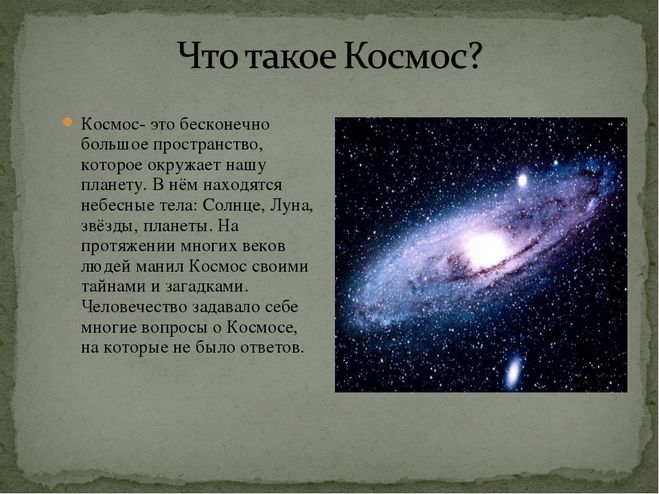 Космос — загадочная и малоизведанная область во Вселенной. С давних времён, человек, глядя вверх на сверкающие звёзды, мечтал узнать все тайны космического пространства, а главное, побывать там, узнать, если жизнь, кроме нашей планеты. Постепенно, космос раскрывал одну тайну за другой, учёные узнавали много чего нового, но и настоящему времени, человечество знает только малую толику скрытых там тайн и загадок.