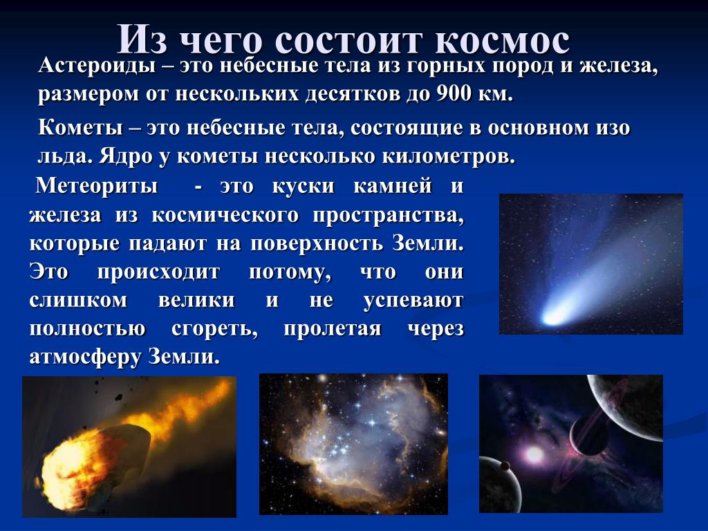 Космос всегда интересовал человека, поскольку жители Земли быстро поняли, что их планета не единственная во вселенной. Они смотрели в небо и днем видели там солнце, а ночью — луну и звезды. Иногда над поверхностью нашей планеты пролетали светящиеся кометы, а иногда на землю падали метеориты. Полное сочинение>>>