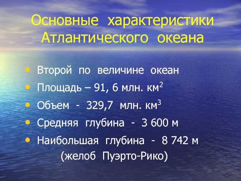 Размеры океанов Тихий — 179 млн. км2, Атлантический-91.6 млн. км2 Индийский — 76,2 млн. км2, Северный Ледовитый — 14,75 млн. км2