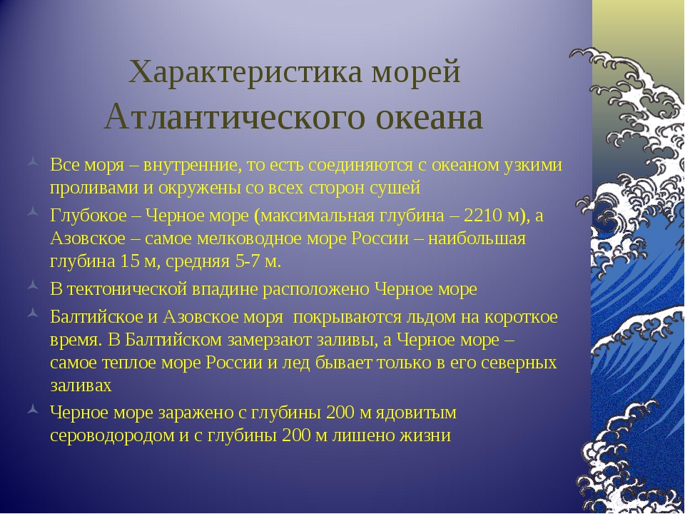 Моря выделяют внутренние и окраинные. Внутренние моря достаточно глубоко вдаются в сушу (например, Средиземное), а окраинные прилегают к суше одним краем (например, Северное, Японское).