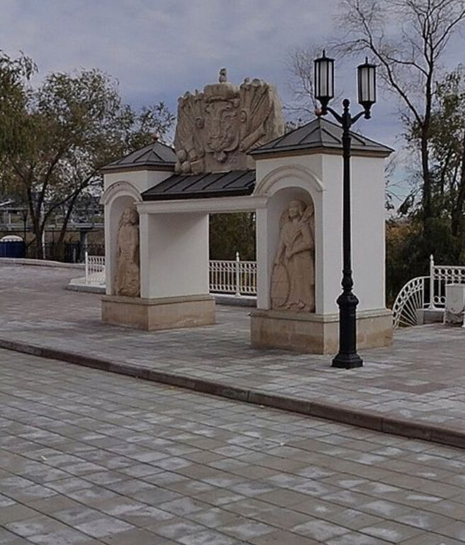 Это один из символов города! История их появления связана с восстаниями башкир на Оренбургских землях в 1755 году. Тогда губернатор Оренбурга И.И. Неплюев героически подавил восстание башкир. В память об этом императрица Елизавета дарит ворота, которые приказывает установить на выезде из города, в сторону степей, чтобы все кочевники помнили о мощи Российской армии. Со временем ворота разрушились. Их фрагменты можно посмотреть в краеведческом музее. А в 2008 году на набережной установили их копию.