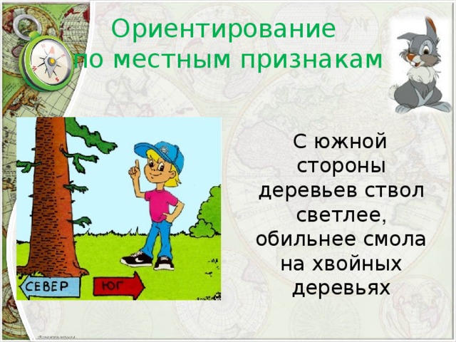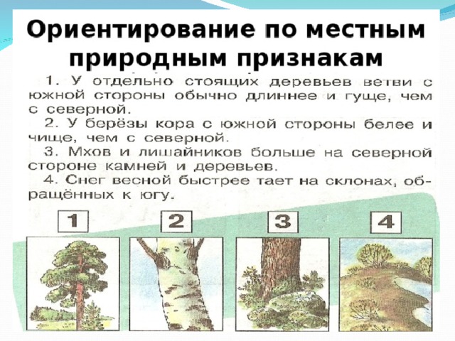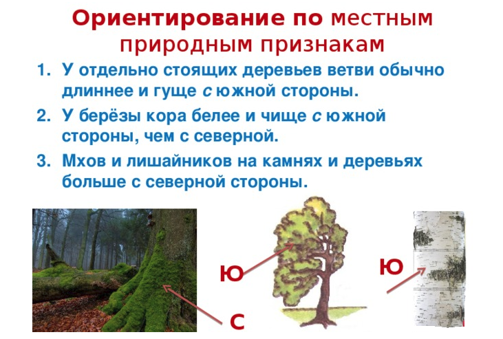В учебниках часто советуют обращать внимание на кроны деревьев. Считается, что с южной стороны они более густые, с крупными ветвями, кора там светлее и суше, чем с северной стороны.