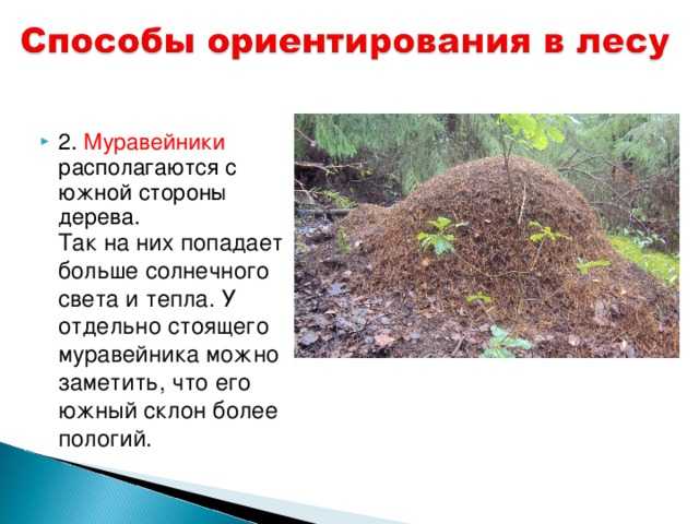 Поможет определить стороны горизонта и обычный муравейник. Обычно он расположен с южной стороны дерева, так как иначе на него бы падала тень. Муравьям же необходимы солнечные лучи. Кроме того, склон муравейника с северной стороны более крутой. Природные ориентиры нужно обязательно использовать в комплексе, не полагаясь на какой-либо один. Если внимательно присматриваться к окружающим предметам, а также знать, как ориентироваться по солнцу и компасу, любой поход в лес обязательно закончится благополучно.