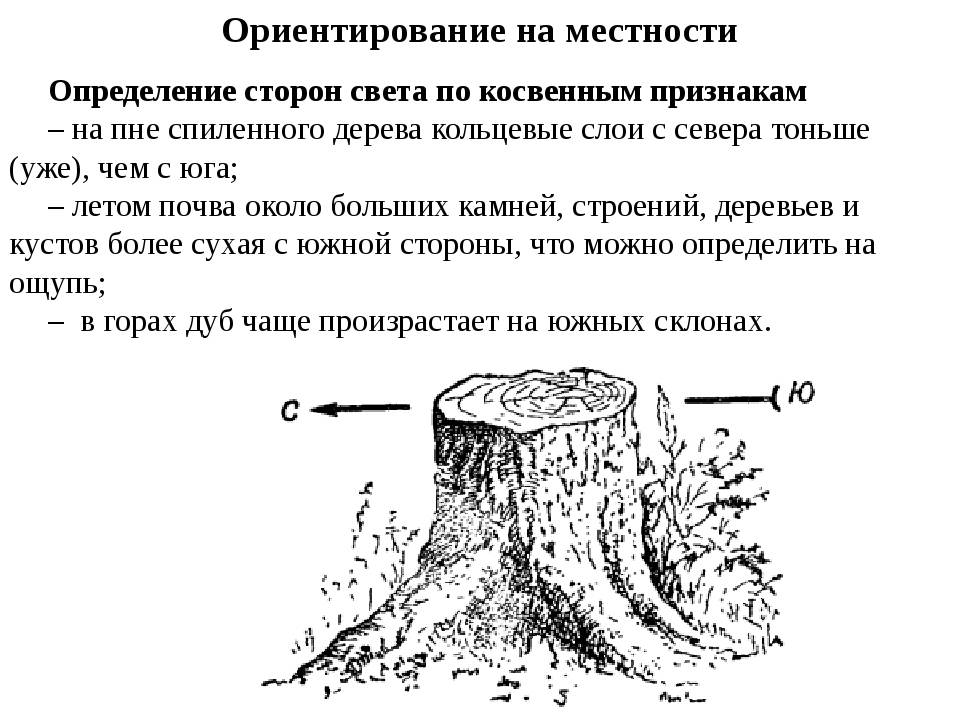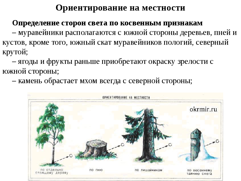 Природные ориентиры. В случае когда выдался пасмурный день, можно воспользоваться другими ориентирами, имеющимися в лесу, так как ориентироваться по солнцу не представляется возможным. Подсказать, где север, а где юг, могут деревья.