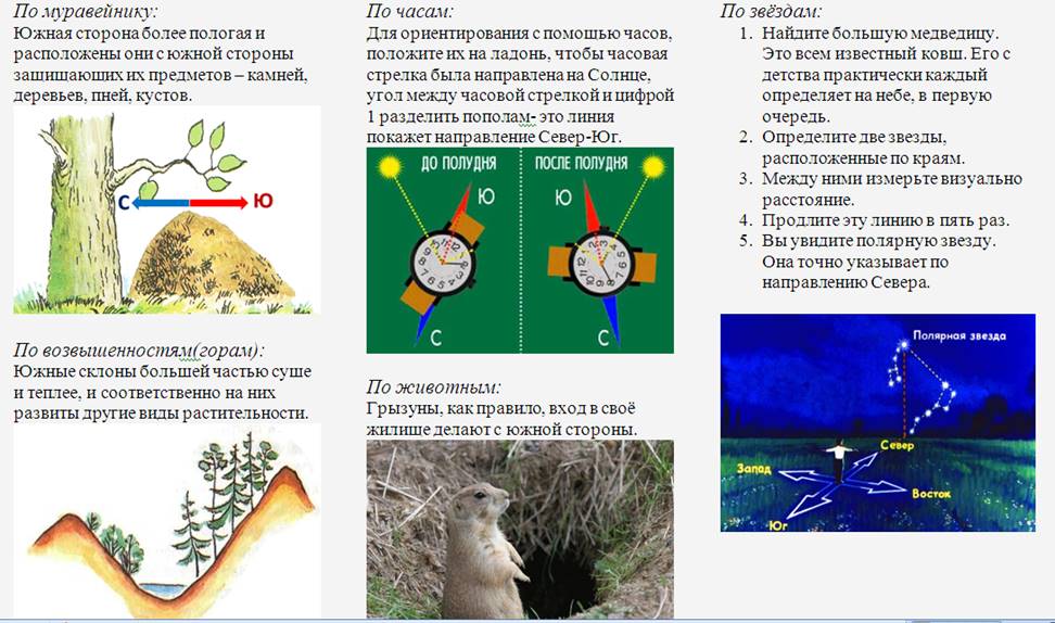 Как можно ориентироваться по солнцу и времени суток. Этот метод очень простой, достаточно знать, в какие часы находится небесное светило в определенной точке горизонта. Обязательно нужно учитывать и время года. К примеру, летом солнце находится на востоке – примерно в 6-7 часов утра, в 9-10 часов – на юго-востоке, около 13 часов – на юге, в 15-16 часов – на юго-западе, а в 21 час – на северо-западе. Ориентирование по часам и солнцу Точнее определить стороны горизонта помогут самые обыкновенные часы с циферблатом. Цифровой индикатор в этом случае не подойдет.