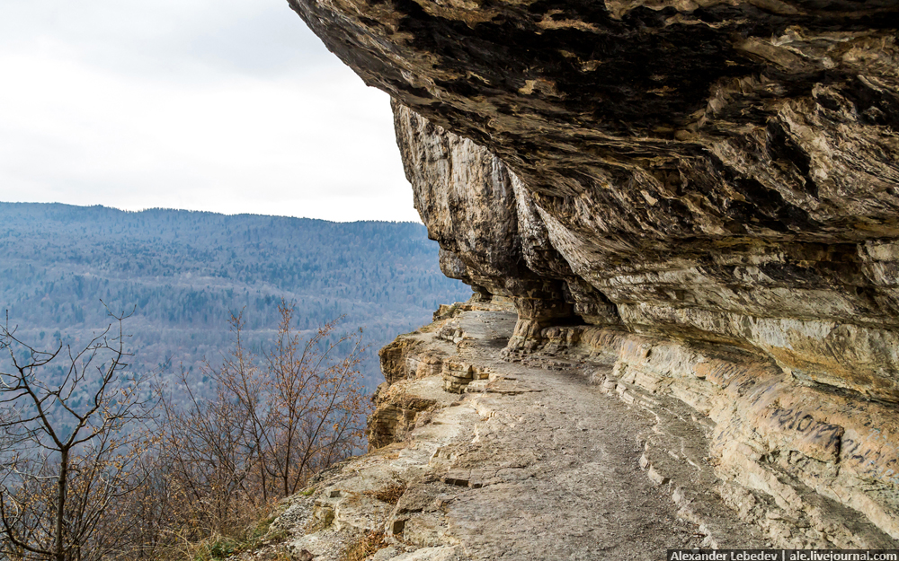 Сам уступ в скале довольно широкий — можно прогуляться и заглянуть “за поворот”, спрятаться от дождя под сводом скал, сварить и выпить вкуснейший чай на травах, как это сделали мы 🙂