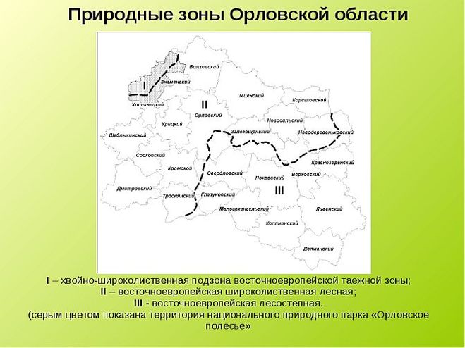В 1994 году Правительством Российской Федерации создан Национальный парк «Орловское Полесье». «Орловское Полесье» расположено на территории Хотынецкого и Знаменского районов в северо-западной части Орловской области. Он находится на стыке двух зон с разными природно-климатическими условиями – широколиственных лесов и лесостепи. Общая площадь парка составляет 17 745 га. Лесной массив занимает 33 000 га, остальную часть общей площади парка занимают сельскохозяйственные угодья. Имеется пять участков леса: Красниковское, Пешковское, Тургеневское, Михайловское, Льговское и несколько ферм и предприятий.