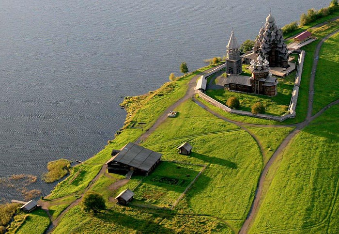 Пожалуй, самая главная достопримечательность – это Преображенская церковь (1714г.). Церковь построена без единого гвоздя и имеет двадцать два позолоченных купола, вид которых с высоты птичьего полета, отделяет храм от других памятников архитектуры острова. Храм выполнен так, что вместе с прирубами с четырех сторон света образует крест.