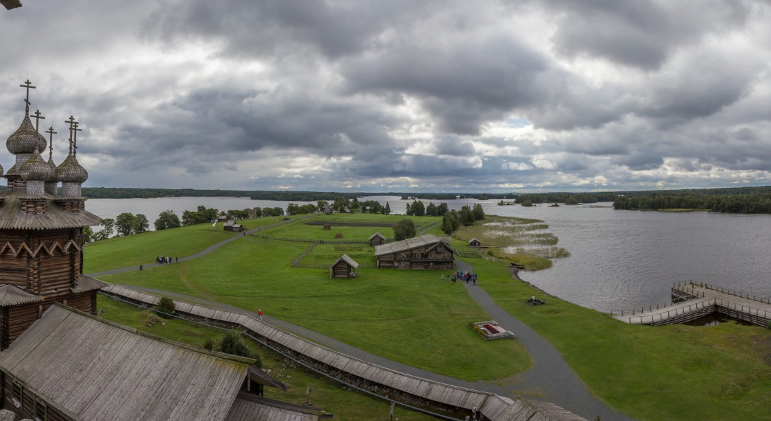 Небольшой остров Кижи (6 х 1,5 км), на котором они расположены, находится в северной части Онежского озера (считается вторым по величине озером в Европе). Сам остров представляет собой «Музей под открытым небом» с рядом деревянных зданий, воссозданных из других мест в регионе (включая еще 2 церкви, одна из которых относится к 14 веку и считается старейшим деревянным зданием в России). . Мы были несколько обеспокоены тем, что это умалит влияние «оригинальных» церквей с надписями (которые восходят к 18 веку). Надпись ЮНЕСКО также беспокоила этот аспект. На самом деле, по ряду причин, мы чувствовали, что расширение участка за его исторические рамки было успешным использованием пространства, доступного на острове, даже несмотря на то, что перемещенные здания на южной оконечности острова можно было увидеть с высоты. Погост.