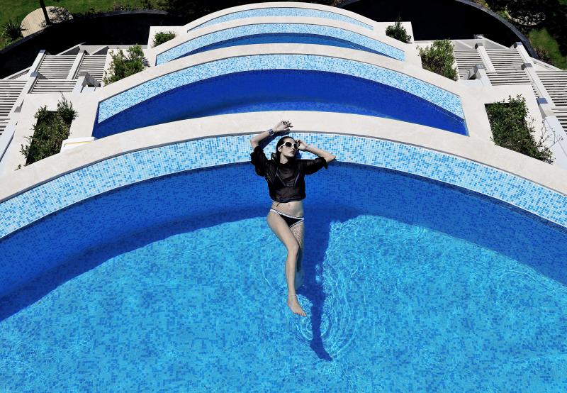 Уникальная фреска с изображением бассейна изображает муз дизайнера и подсвечивается ночью. Этот открытый бассейн накрывается и подогревается в холодные месяцы, создавая ощущение, будто вы находитесь в помещении.