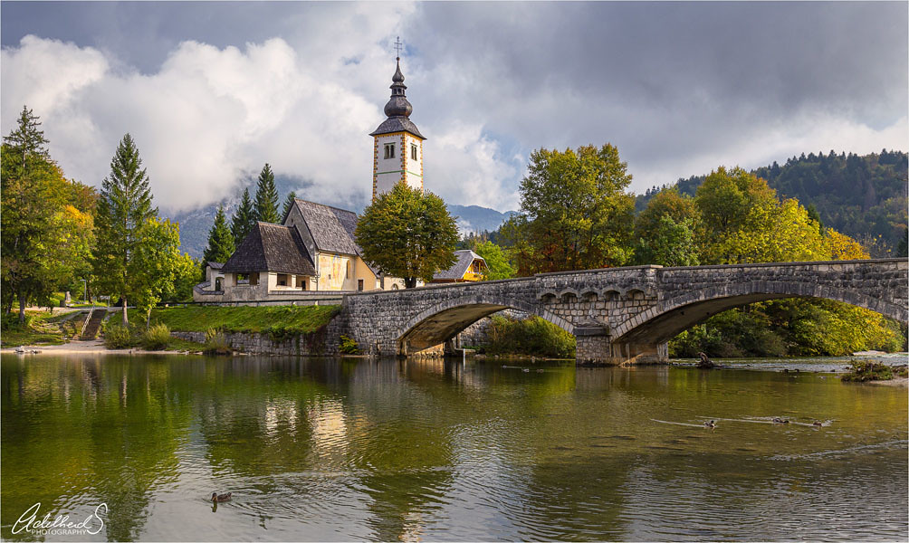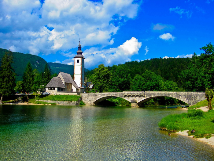Этот вид на каменный мост с церковью Св. Иоанна Крестителя на заднем плане является культовым видом на озеро Бохинь.
