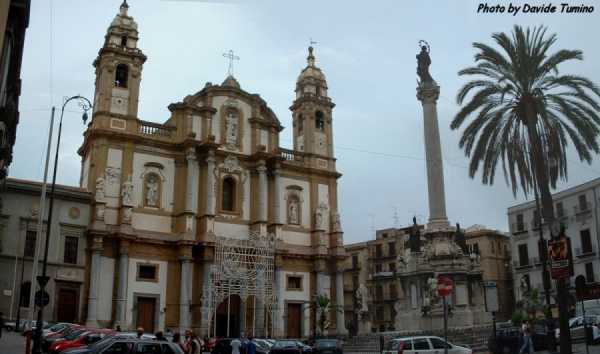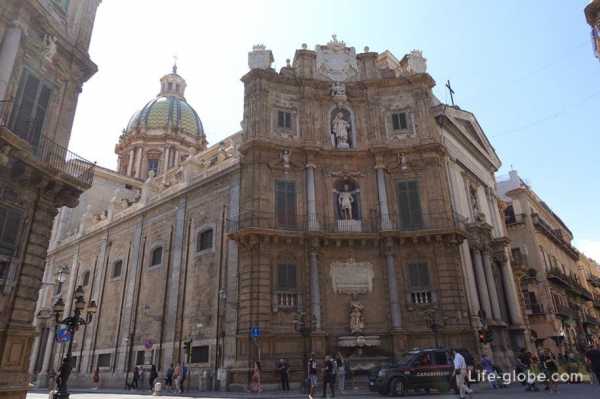 Пересекаются Via Maqueda и Via Vittorio Emanuele на площади, которую по какому-то математическому недоразумению назвали Quattro Canti — Четыре угла. Недоразумение в том, что углов на площади восемь — у каждого из четырёх зданий один угол скошен. На получившихся плоскостях размещены скульптуры и барельефы, символизирующие времена года. Преимущества плановой застройки налицо: площадь выглядит очень оригинально, и могла бы стать жемчужиной города, если бы не многочисленные конкурирующие извозчики.