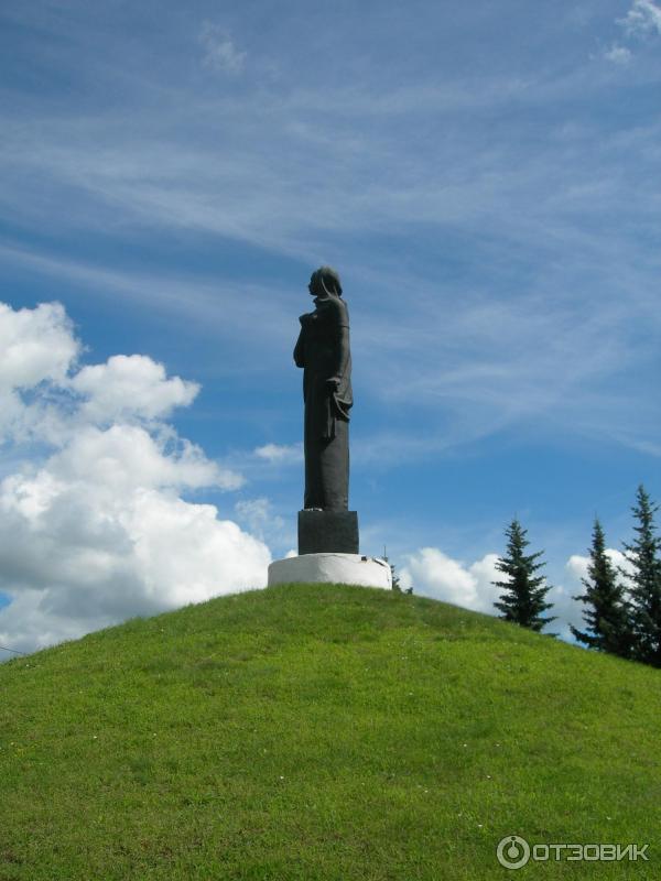 - Позади бронзовой скульптуры – Успенская церковь с пятью главами и колокольней.