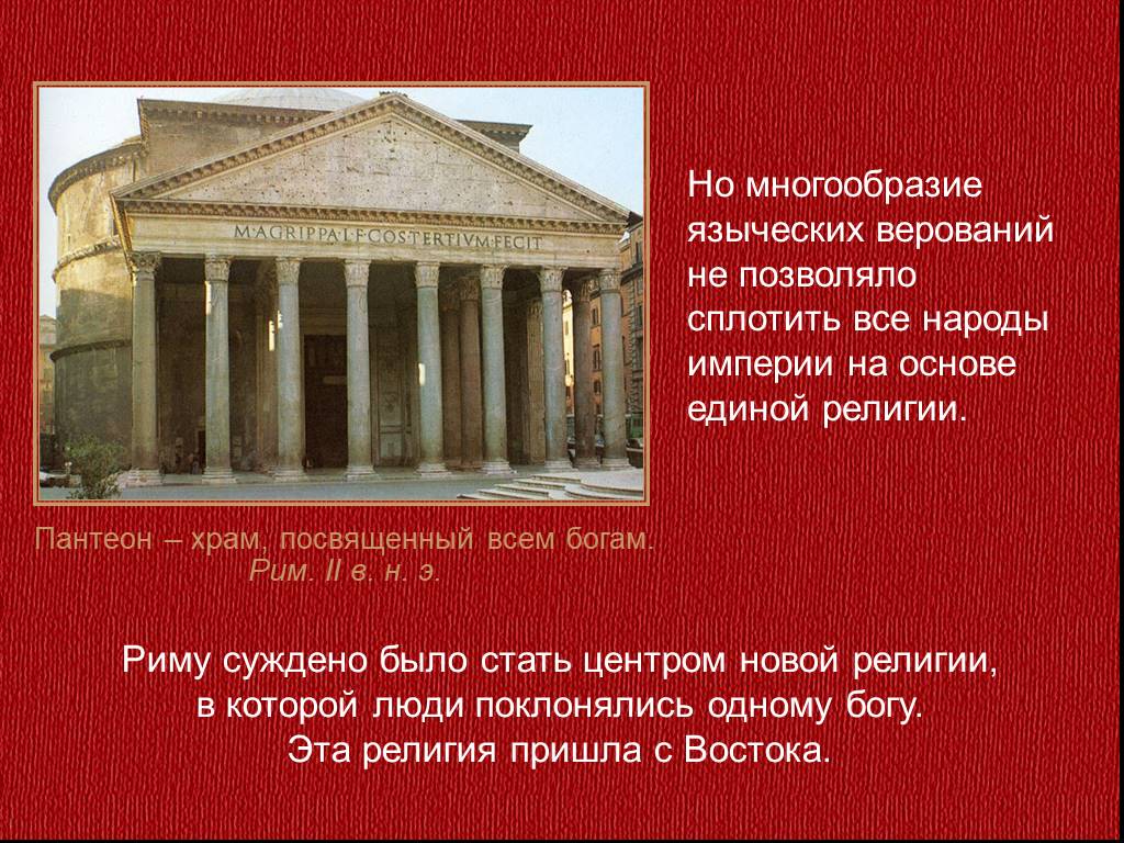 В честь победы Рима на мысе Акций, окончательно утвердившей власть императора, Агриппа на народные деньги построил римский Пантеон – первый храм, посвященный главным богам: Юпитеру, Венере, Меркурию, Марсу и другим богам-олимпийцам.