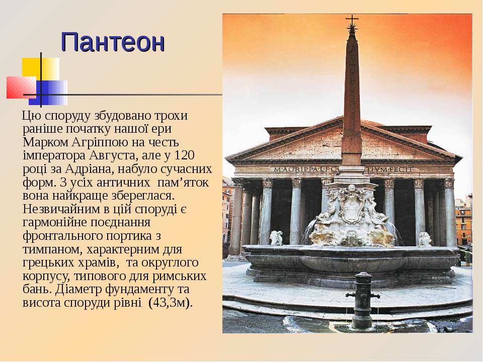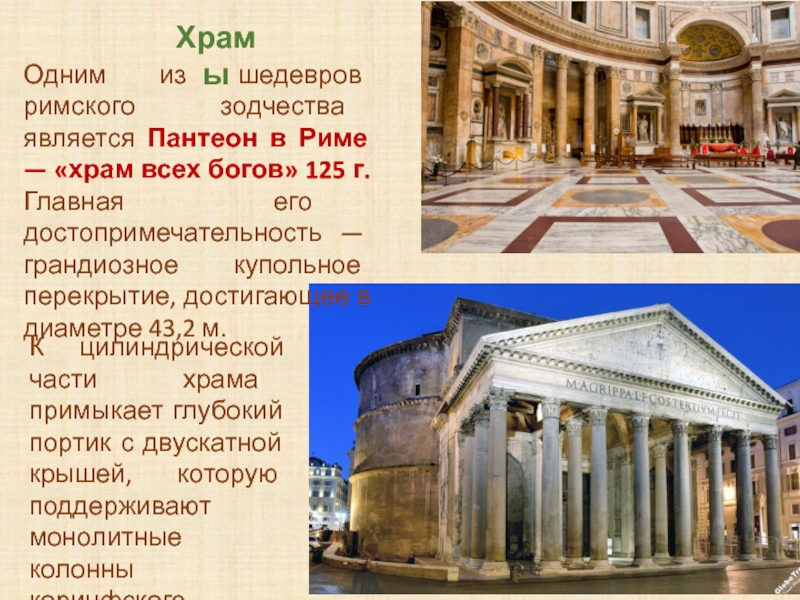 Пантеон (итал. Pantheon) — исторический и архитектурный памятник Древнего Рима. Первоначально известен как античный Храм всех Богов, однако после падения Римской империи освящён как христианская Церковь святой Марии и Мучеников.