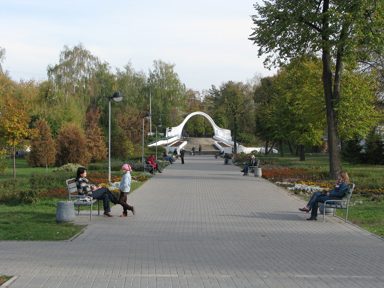 Парк разбит на аллеи, на главной его площади располагается водоем с фонтаном посередине. Боковые аллеи замыкаются в кольцо, по которому любят прогуливаться горожане, а молодежь здесь катается на роликах и велосипедах летом, на коньках зимой.