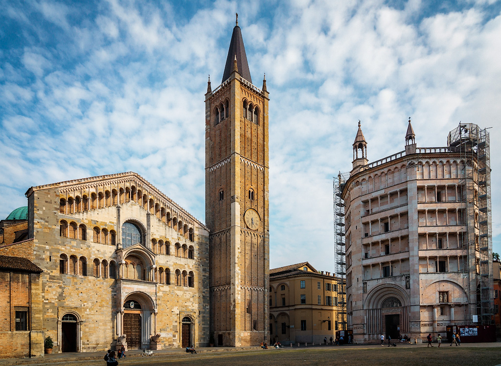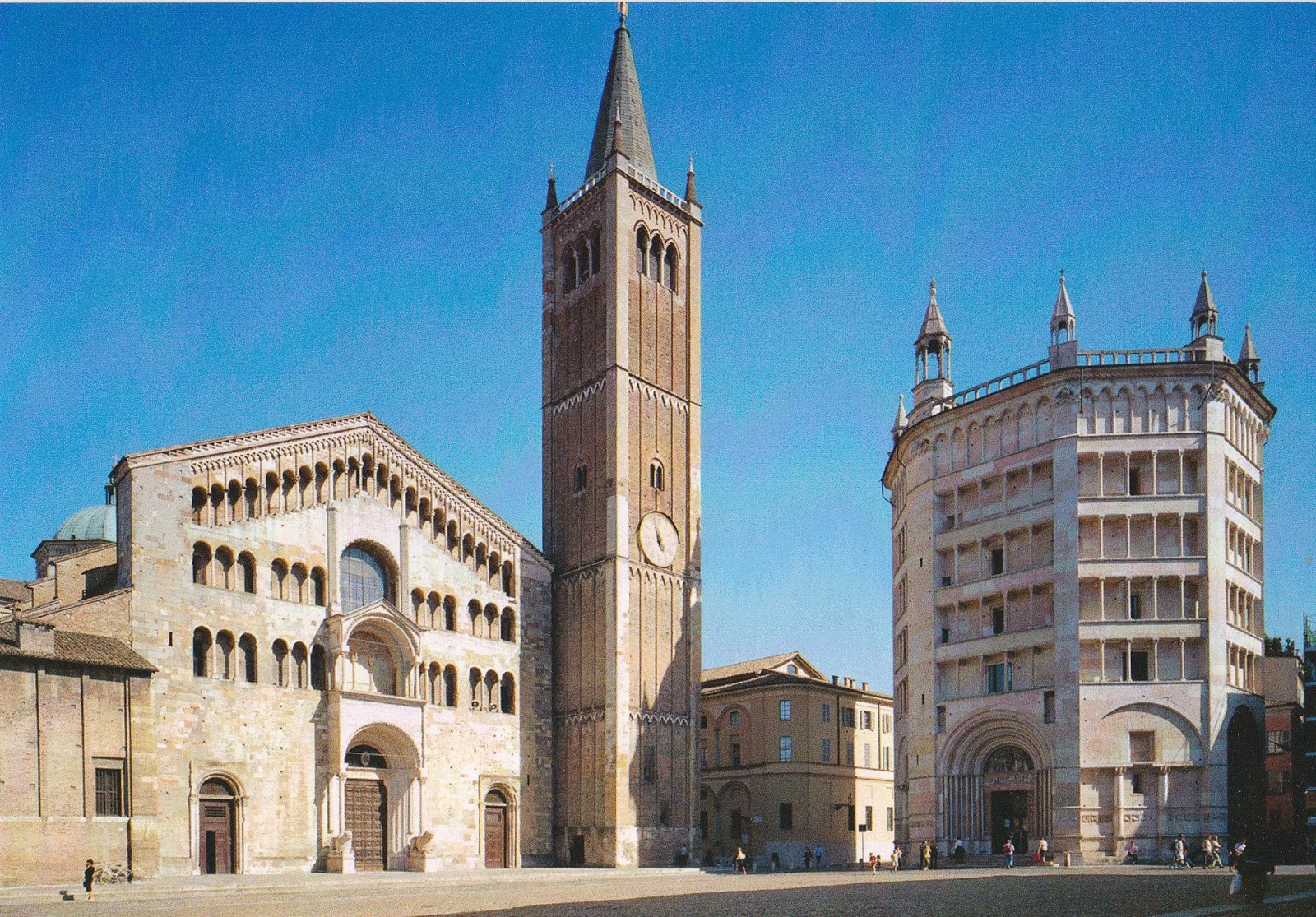 Исторический центр Пармы развивается вокруг так называемого религиозного центра, состоящего из собора, баптистерия и епископского дворца.Собор, находящийся на одноимённой площади, несмотря на многочисленные перестройки, является замечательным примером местного романского стиля. Особый интерес представляют колокольня XIII века, внутреннее убранство собора и купол с фресками Корреджо.
