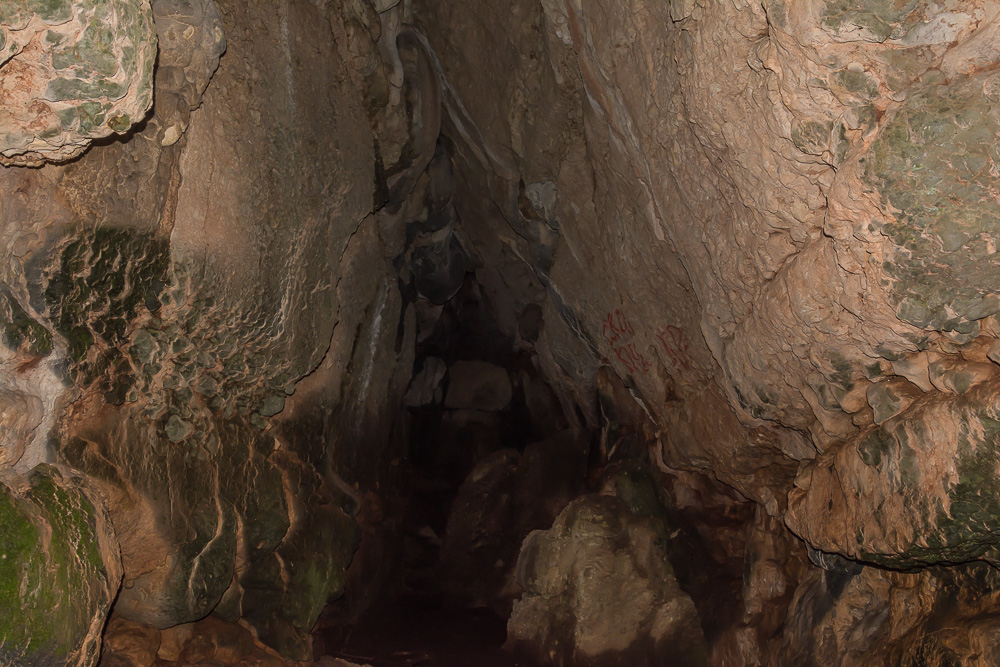 Может показаться на первый взгляд, что тропа над обрывом ведет не ясно куда, причем даже, когда стоишь фактически вблизи с пещерой, ничто не дает ее присутствия: вход находится под выступами скал, хотя абсолютно внезапно за одной из них открывается высочайшая полукруглая арка.